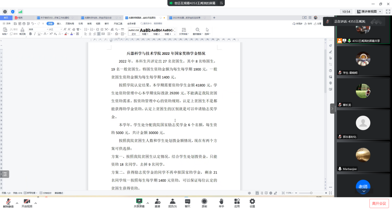 2022年11月4日下午,亚洲国产精品无码观看久久召开学院奖助委员线上会议,研究并讨论本科生国家助学金和国家奖学金评审原则、普瑞斯企业奖学金评定办法。评审委员会成员马保吉、郭永春、蔡长龙、王春阳、吴杰、霍文俊参与了评审委员会。辅导员王国栋,本科生研究生各一名代表参加了会议,会议由党委书记马保吉主持。
