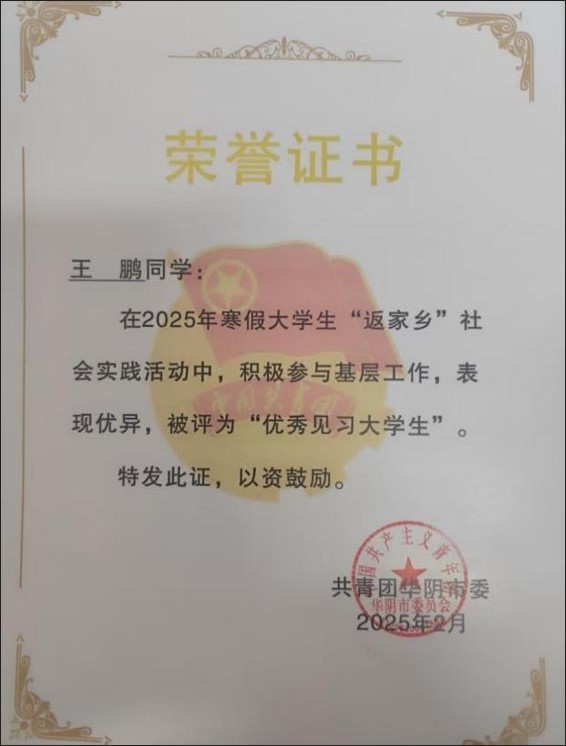 2025年寒假期间,兵器学院23级武器系统与工程专业本科生王鹏、张智超积极响应学院以及学校关于“返家乡”社会实践的号召,分别在华阴市罗敷镇政府与华阴市委统战部实习工作。